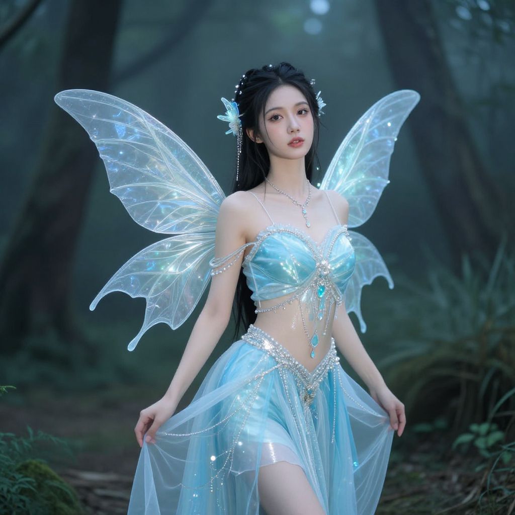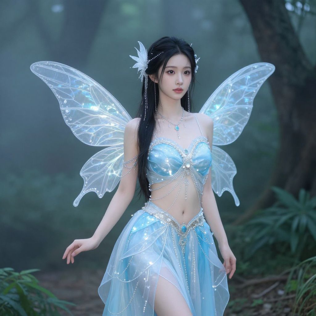 A luminous young woman adorned in ethereal blue attire and translucent butterfly wings stands serenely in a misty forest, embodying the enchantment of a mythical fairy realm.