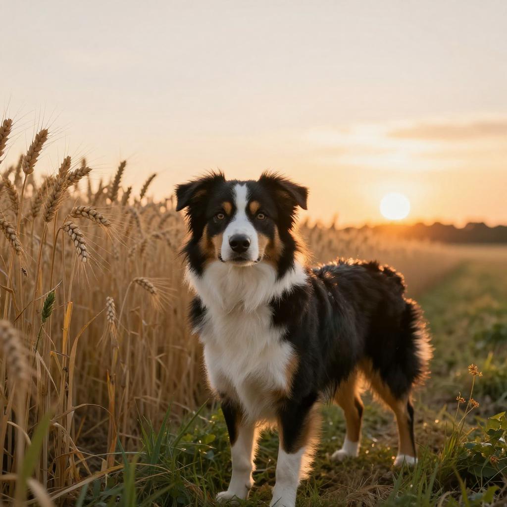 A black, white, and brown Australian Shepherd dog standing in a grassy area next to a ripe wheat field during a warm, golden sunset. The dog has a fluffy coat and alert expression, with the sun setting low on the horizon, casting a soft glow over the landscape.
