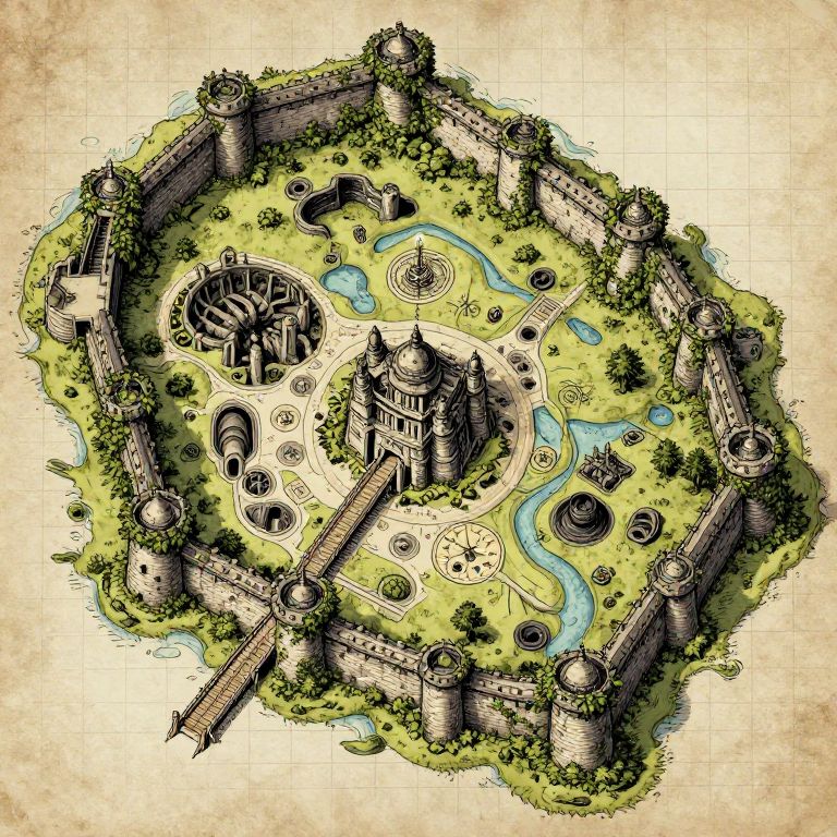 Fort DnD map illustrating a strategic battle stronghold with moat, drawbridge, walls covered in ivy, underground dungeons, and magical wards, hand-inked fantasy cartography style with grid overlay and weathered paper background.