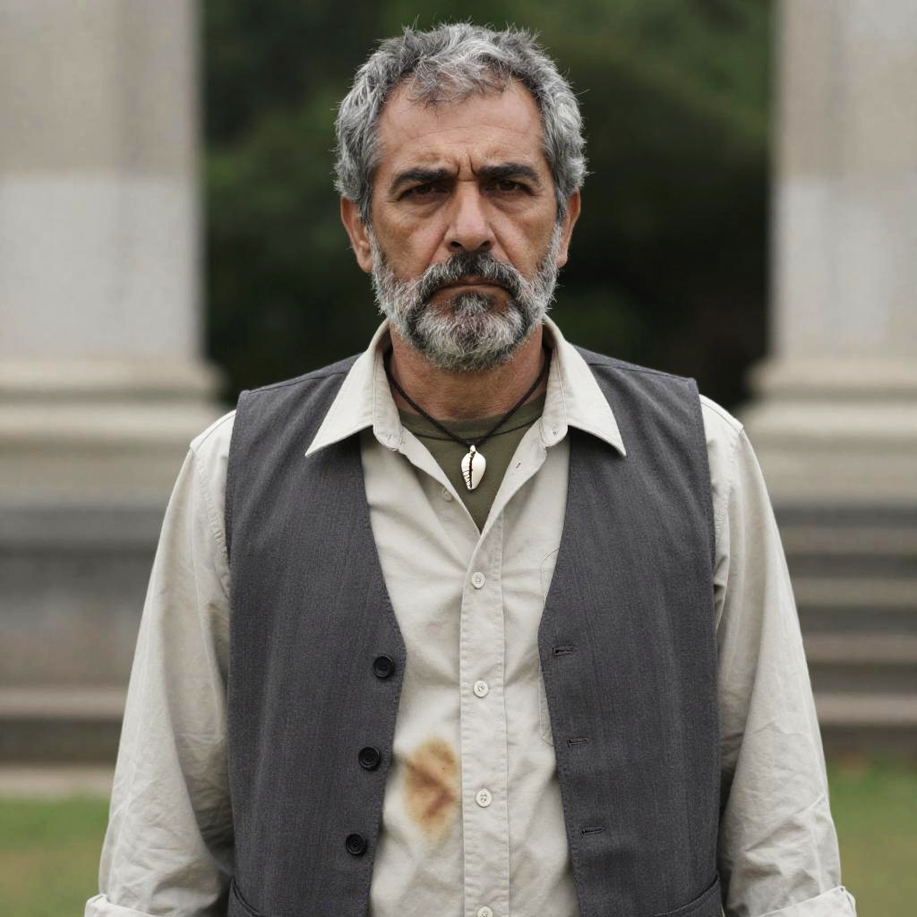 Middle-aged man with graying hair, beard, and intense expression. Wearing teal button-up shirt, brown suspenders, and dark pants. Standing on dimly lit urban street at night. Background includes brick buildings, streetlights, and blurred street signs.