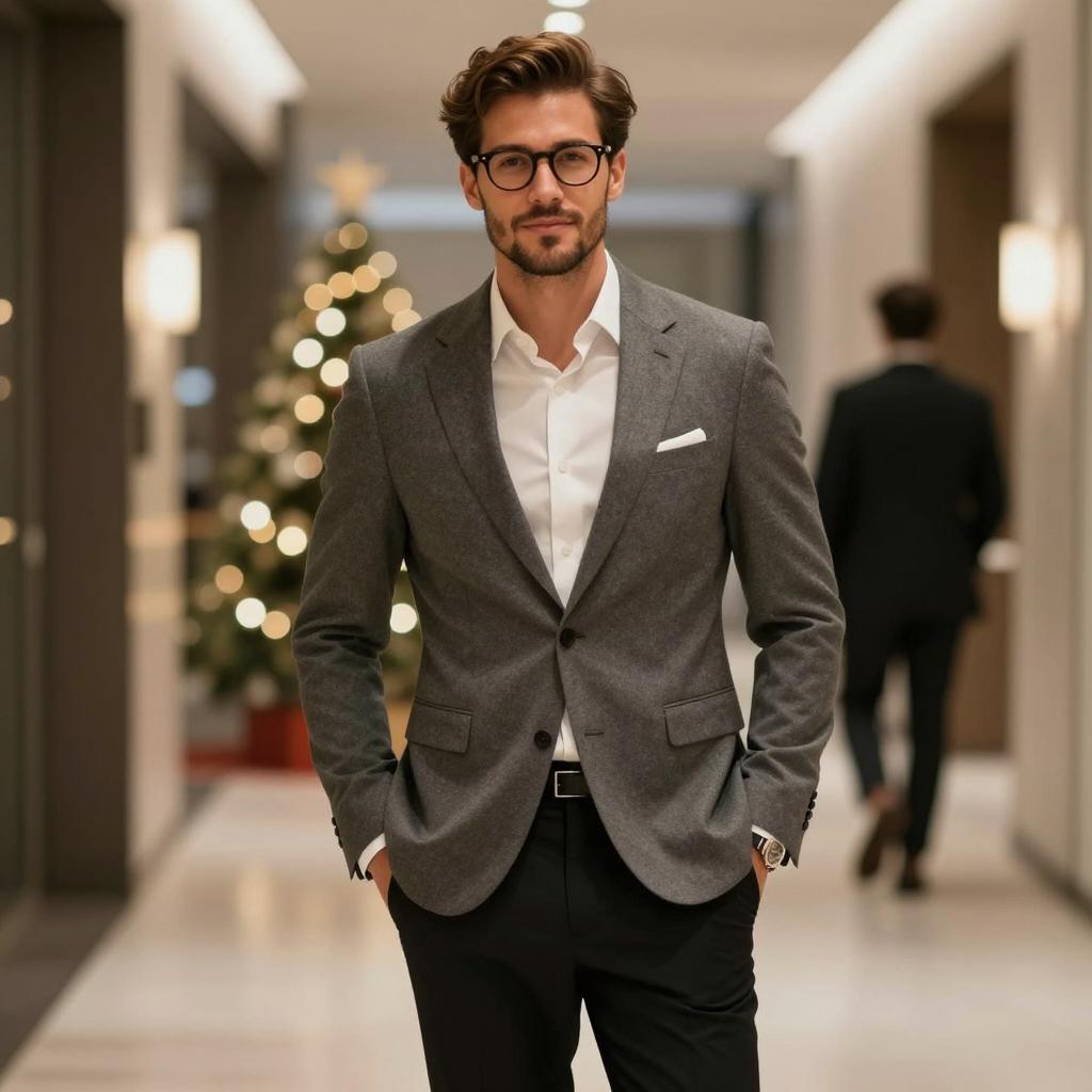 Smart business attire male, photorealistic portrait of a handsome man, standing outdoors, city background, wearing a dark navy suit, white shirt, maroon tie, black belt with gold buckle, black-framed glasses, brown hair, short styled, light stubble, right hand touching suit lapel, left hand in pocket, confident expression, modern building architecture in background, daytime, business attire, stylish, professional look, realistic lighting, sharp focus on subject, slightly blurred background