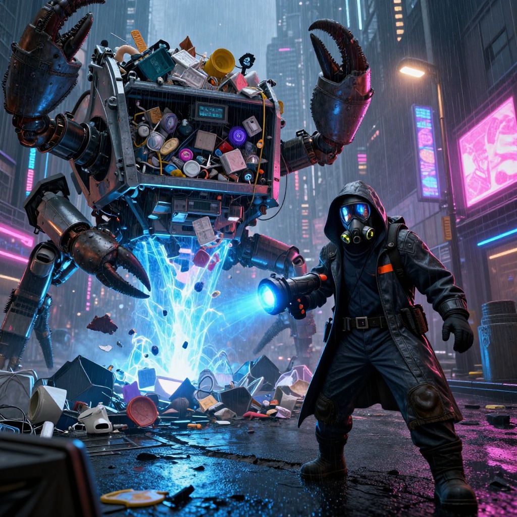 In a sprawling cyberpunk metropolis, a lone garbage collector works amid neon-lit grime, shrouded in a high-tech cloak that repels acidic rain, His face is obscured by an industrial-grade respirator mask with glowing filters, casting reflections of flashing ads and street lamps, Moving with purpose, he wields a portal-generating cannon humming with energy, With a press of a trigger, an electric-blue portal appears beneath a towering pile of discarded machinery, swallowing the debris into another dimension, His companion is a massive, crab-shaped mobile garbage collector, whose metallic legs click as it navigates the gritty streets, The trash is deposited into the crab’s expanding container, designed to hold vast amounts of waste, The crab’s pincers crush and sort stubborn refuse, while sensors detect and incinerate hazardous materials, As trash falls through the portal, shadows dance across the alley, The garbage collector’s eyes, hidden behind his mask, scan the urban expanse, wary of scavengers and rogue drones, The portal closes with a flash, leaving scorched earth behind, Together, man and machine move on, maintaining the city’s neon dreams by removing its toxic decay