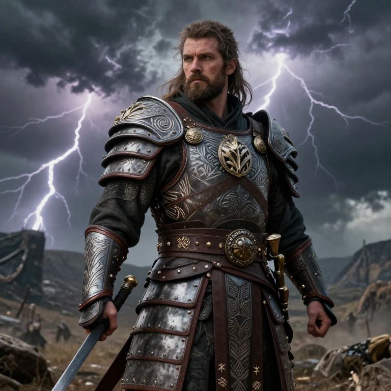 Photorealistic digital artwork of a rugged, bearded man with long, disheveled brown hair, standing in a stormy, lightning-filled landscape. He wears intricately detailed, silver armor with ornate engravings and a dark leather cloak. A large, decorative emblem is centered on his chest plate. His right hand grips a sword's hilt, and his left hand rests on his hip. The background features dark, stormy clouds, jagged mountains, and distant, indistinct figures. The overall color palette is dark and moody, with prominent blues, grays, and flashes of white lightning. The image exudes a medieval fantasy warrior vibe.