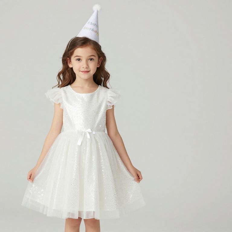 "White Sparkly Birthday Dress, young girl wearing a party hat and dress"