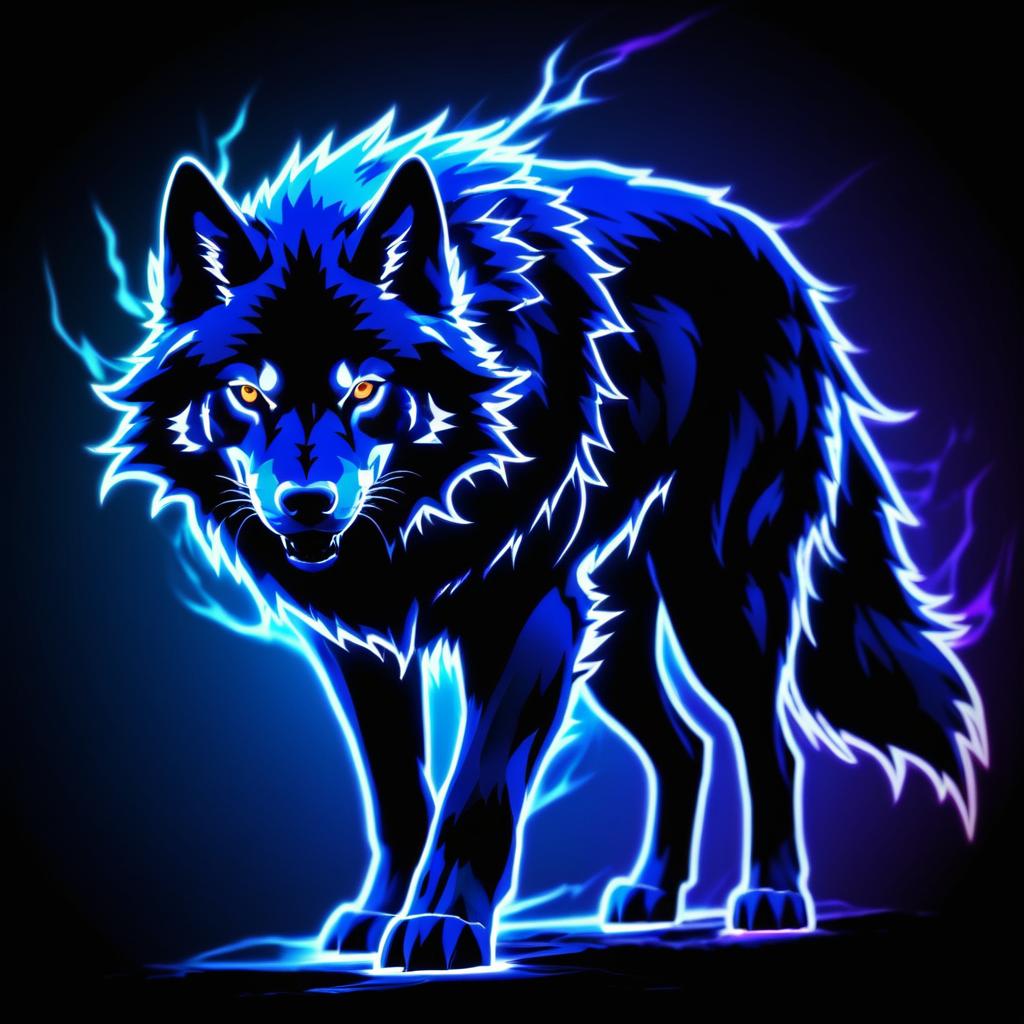 Digital illustration of a menacing shadow wolf with intense blue glowing effects. The wolf has sharp features, fiery orange eyes, and is set against a dark background with glowing highlights emphasizing its fur and fierce expression.