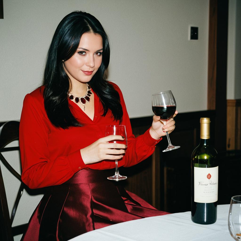 Wine tasting costume,1girl, solo, realistic, wine glass, jewelry, skirt, shirt, drinking glass, cup, wine, necklace, wine bottle, looking at viewer, alcohol, brown skirt, black hair, red shirt, long sleeves, indoors
