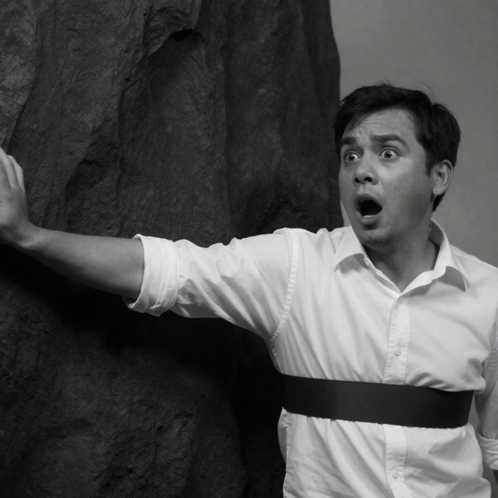 Black and white photograph of a shocked man in a white shirt with a dark armband, leaning against a wall. Dark, ured rock or tree on the left, man's mouth open, right arm extended. Intense expression.