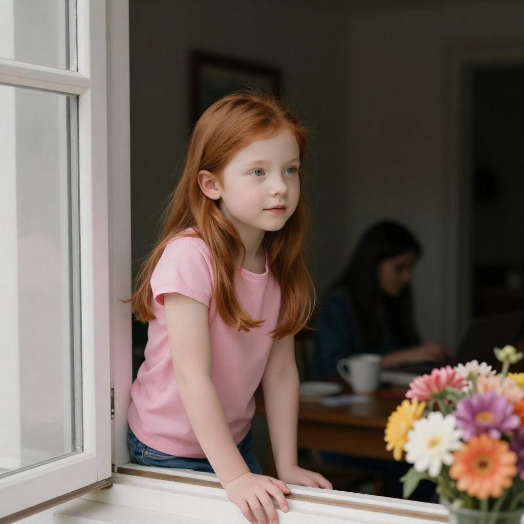 Photograph of a young blonde girl with a braid, wearing a white lace-trimmed shirt, gazing to the left with a thoughtful expression. She holds her right arm close to her chest. The blurred background features soft, muted colors. A small, white, fluffy dog is partially visible in the lower left corner.