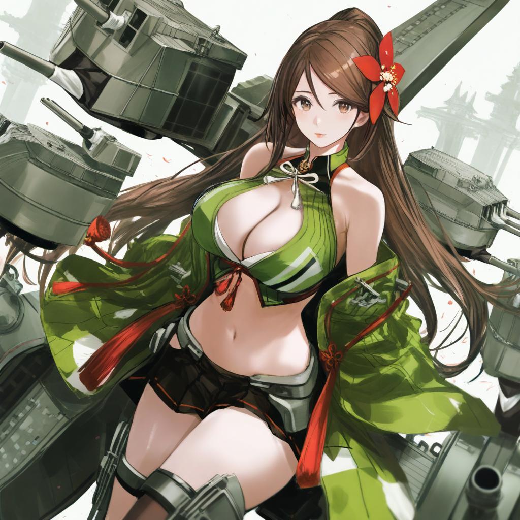 Digital artwork of a brown-haired anime girl with brown eyes and a red flower in her hair styled in a ponytail. She wears a green, revealing traditional-inspired top with a black mini skirt and thigh straps. Surrounding her are large, mechanical warship turrets, suggesting a fusion of human and naval elements. The design includes details like a mole under her eye and a confident expression.