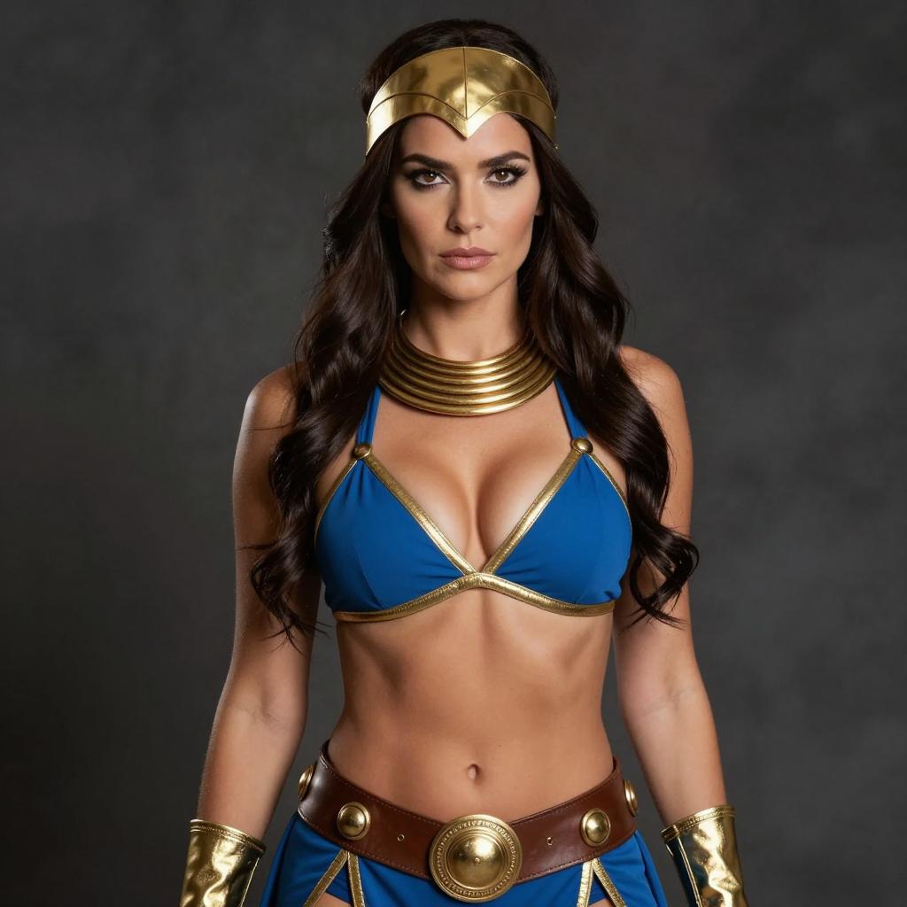 Dramatic studio portrait of a woman wearing a costume inspired by the iconic Slave Leia outfit from Star Wars. She is dressed in a blue bikini-style top with gold trim, a metallic gold headband, a gold necklace, a brown leather belt with decorative elements, and matching gold wrist cuffs. The woman has long dark hair and a serious expression, set against a textured dark background.