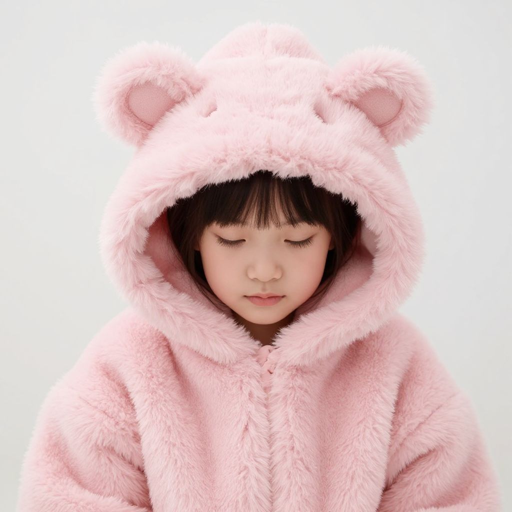 Photograph of an Asian child with fair skin and straight black hair wearing a fluffy, light pink bear hooded coat. The coat has soft, plush textures and bear ears on the hood. The child's eyes are closed, and they have a calm, peaceful expression. The background is completely white, making the pink coat stand out prominently. The child's face is centered in the image, and their head is slightly tilted downward. The overall mood is gentle and serene.