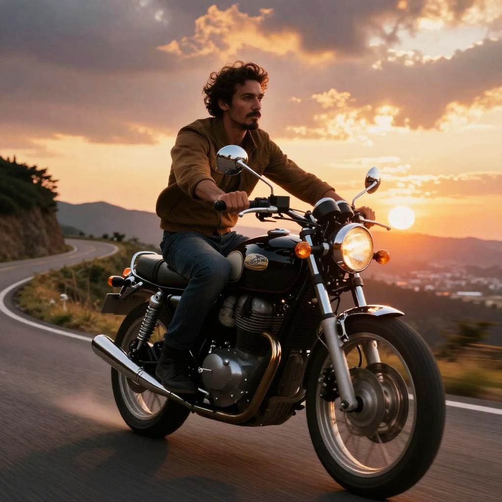 Stylish man with goatee curly hair riding a classic motorcycle on a winding mountain road during sunset, dramatic sky, motion blur effects, vibrant colors, cinematic atmosphere