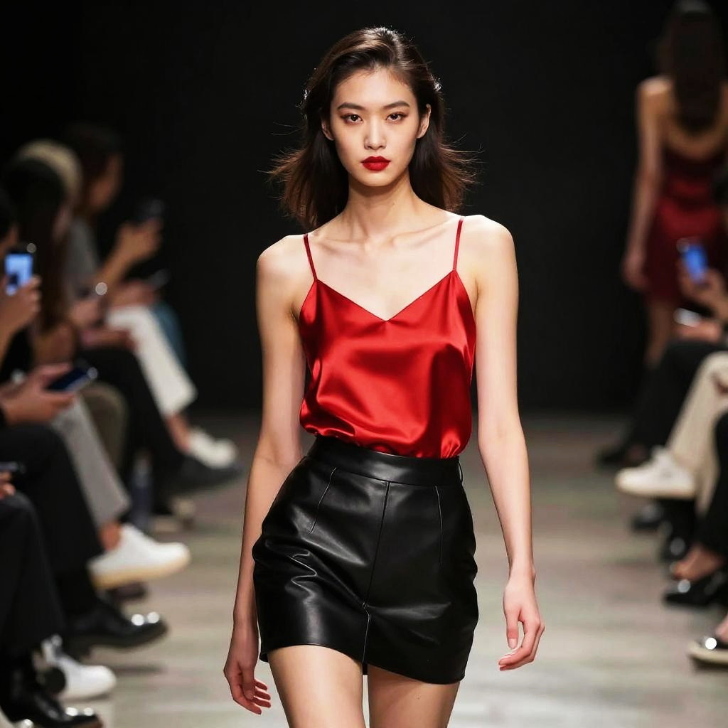 Red satin tank top paired with black leather skirt, high contrast lighting, fashion runway vibe, confident model with bold makeup, sleek hairstyle, modern and edgy look