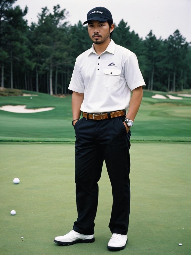 Golf clothes costume, 1boy, male focus, solo, shirt, hat, realistic, belt, white shirt, pants, facial hair, asian, outdoors, watch, looking at viewer, black pants, hands in pockets, collared shirt, wristwatch