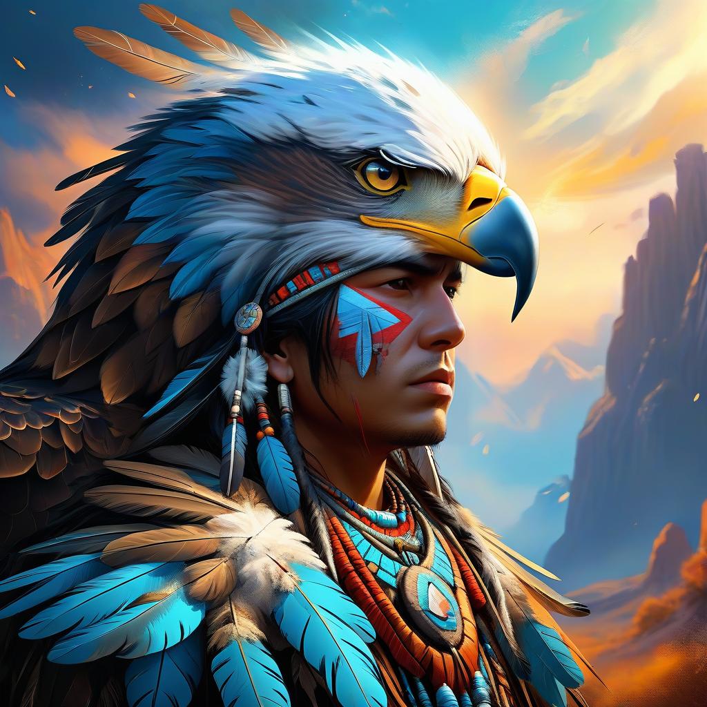Native American shaman fantasy depicting a serene eagle guardian, fantasy magic, anime native style, cosmic and intricate, sharp focus, highly detailed digital painting, concept art, inspired by Jahbu Art, masterpiece quality, vibrant colors