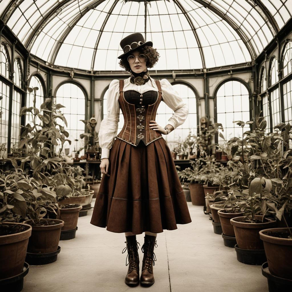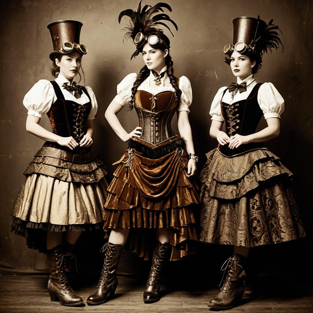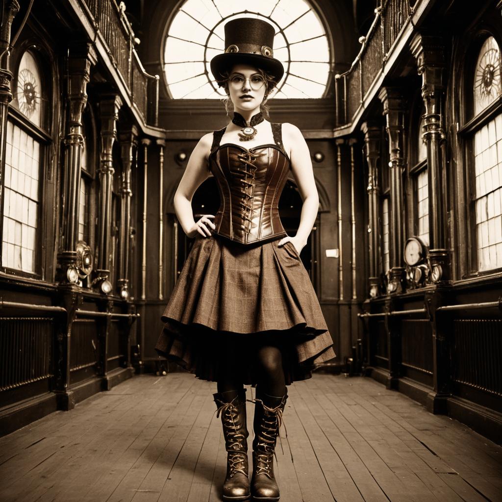 Photo of a Willowy woman, Straight Mid-length, steampunk outfit, Victorian-inspired Rust leather corset, Corduroy lace-up boots, brass goggles, fedora, layered skirts, pocket watch, industrial elements, retro-futuristic style, cobbled city street, polaroid instant photo