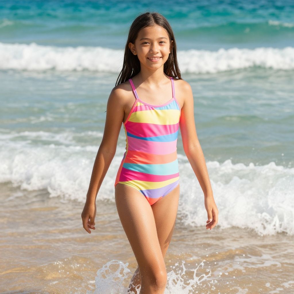 Beach swimsuit 14 year old, vibrant summer day, girl smiling by the shore, colorful swimsuit, playful waves, bright sunlight, realistic style, warm tones