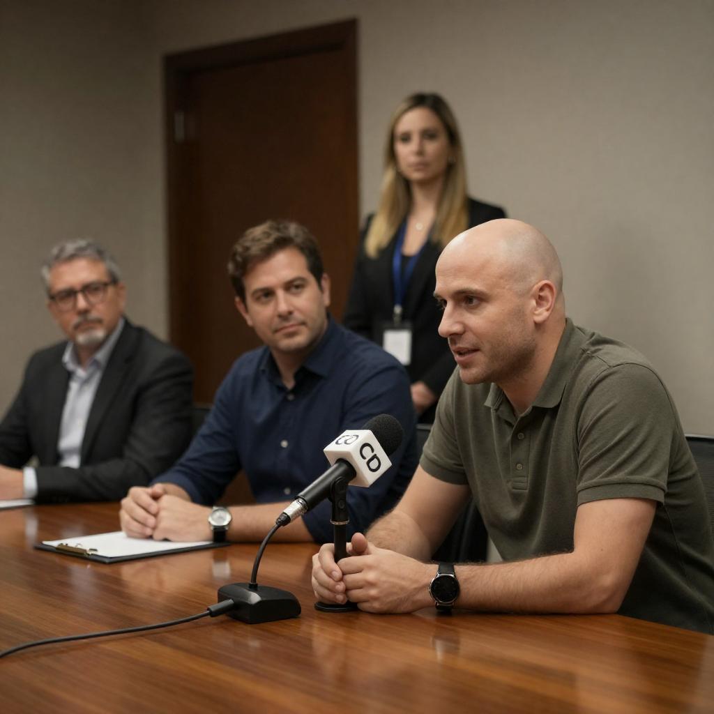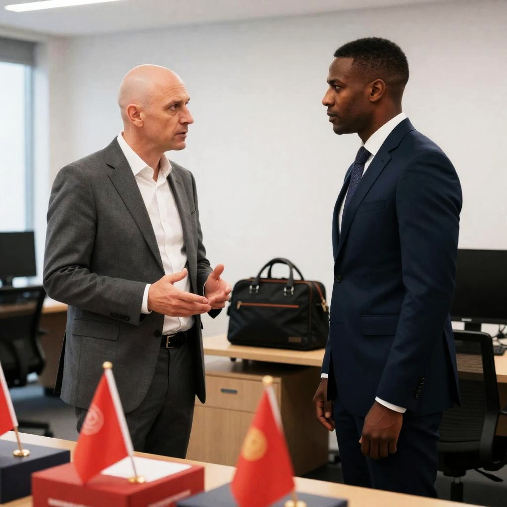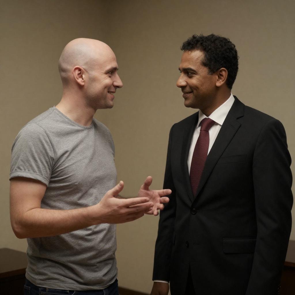 Photograph of two men in a dimly lit room with a ured, beige wall. The bald man on the left, wearing a gray t-shirt, gestures with his hands, smiling at the man on the right, who is dressed in a black suit, white shirt, and maroon tie, also smiling. Both men have light skin and are standing close together.