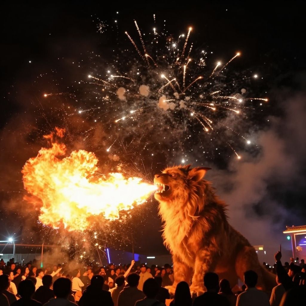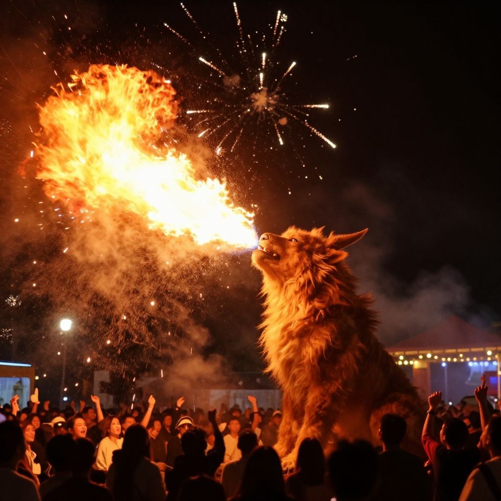 Breathing fire firework magic, a mythical beast exhaling fiery fireworks amid a festival crowd, bright explosive light patterns, dynamic motion, and an enchanting nighttime setting