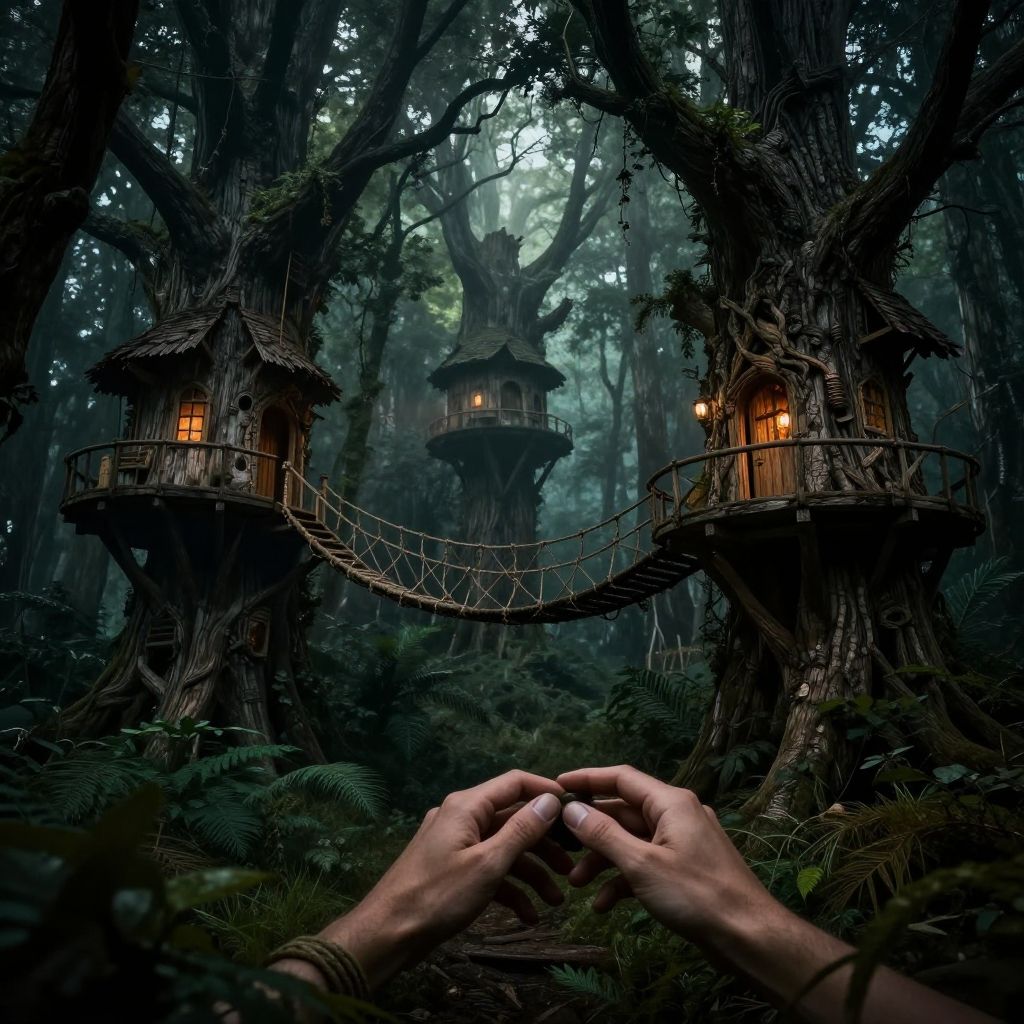 Photograph of a mystical forest with two wooden treehouses connected by a rope bridge, illuminated by warm lights, seen from a pair of hands in the