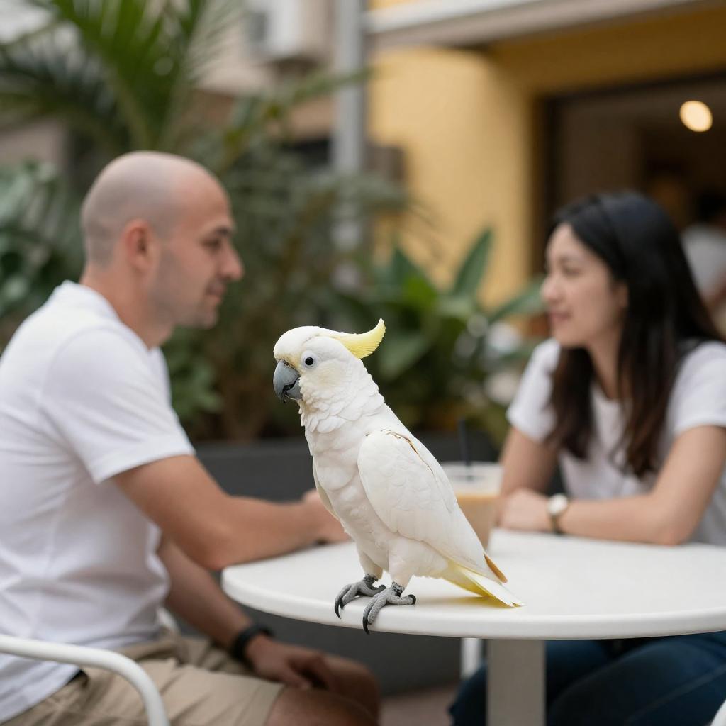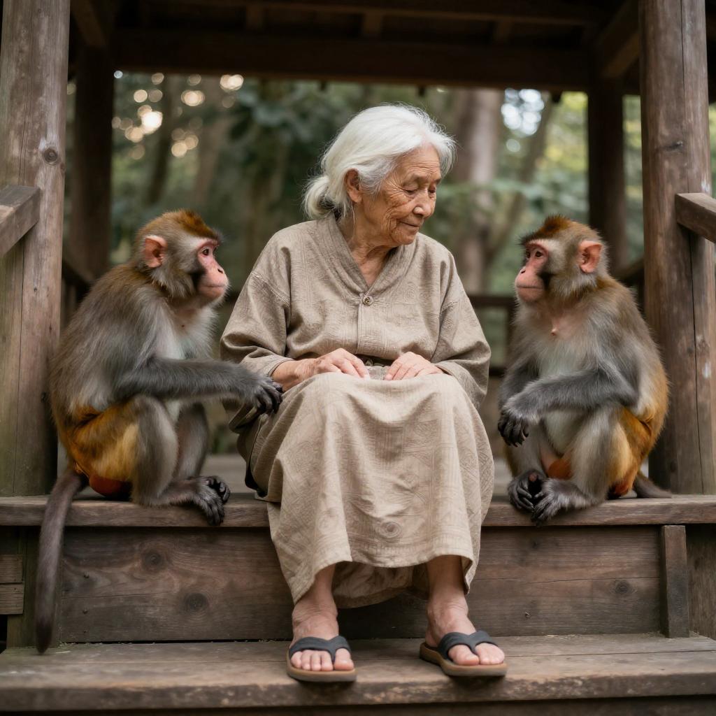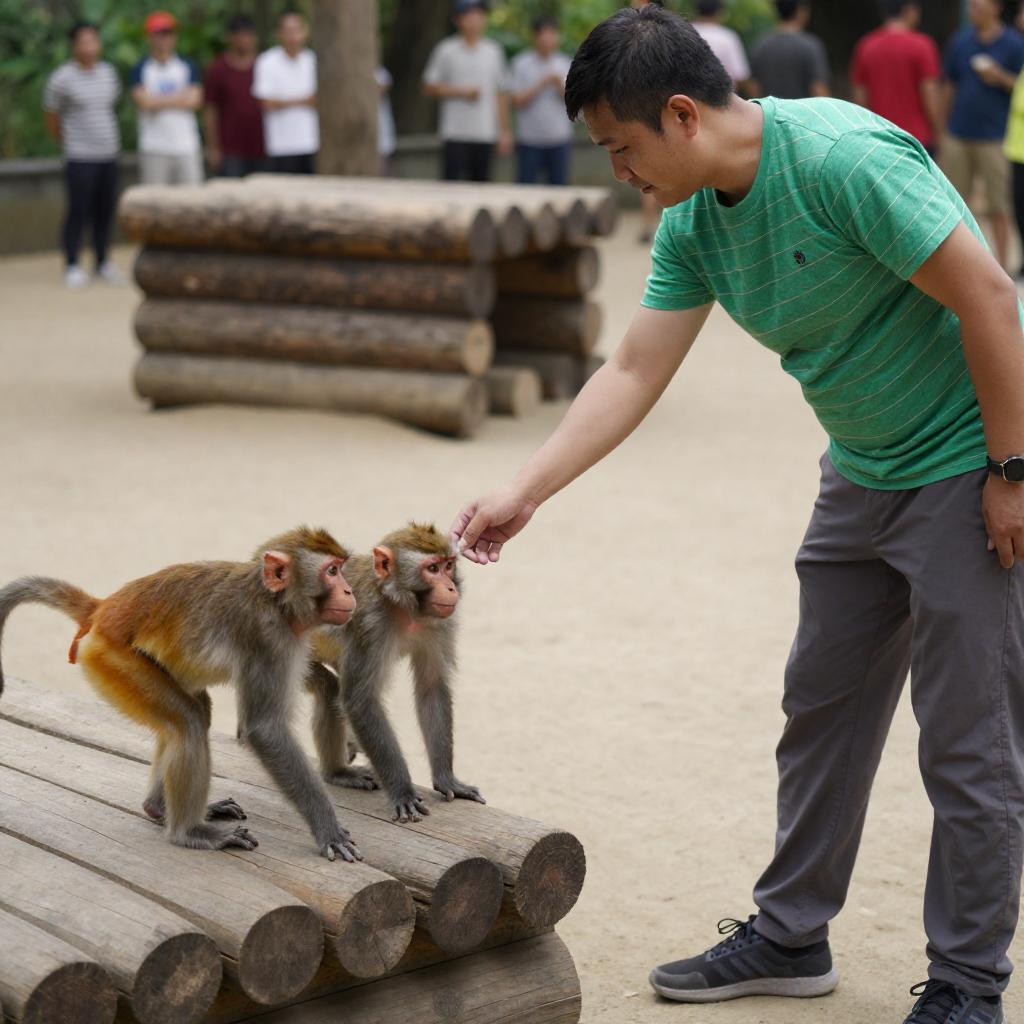 Photograph of a man in a green striped shirt and gray pants interacting with two monkeys in a sandy, wooden obstacle course. Another monkey stands nearby. Background includes stacked wooden logs, a crowd of people, and greenery. The man extends his arm towards the monkeys, who are focused on him.