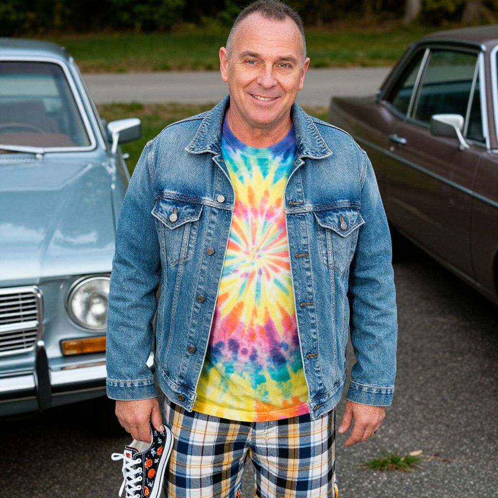Photograph of a middle-aged man with short, dark hair, smiling, standing outdoors in a driveway. He wears a blue denim jacket over a vibrant tie-dye shirt and black-and-white plaid pants. He holds a black-and-white patterned bag in his right hand. Behind him, a light blue vintage car and a dark brown classic car are parked on the gray asphalt. The background includes a grassy area with trees. The image has a high-contrast, slightly exaggerated color style, making the tie-dye shirt particularly vivid.