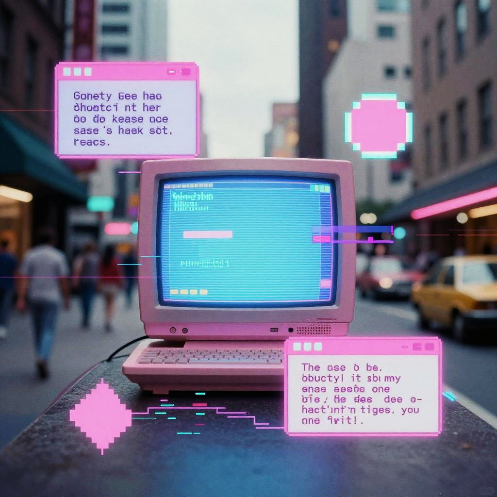 70s AI filter applied to a vintage urban street scene, grainy textures with neon pink and cyan hues, retro computer interface overlays, glitch effects, pixelated graphics, evoking nostalgic cyberpunk vibes with analog warmth, soft focus and light leaks.