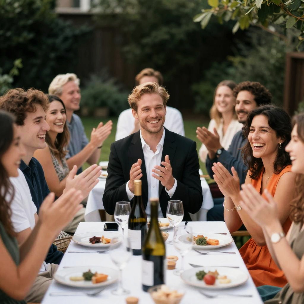 Group of 12 people at an outdoor table, laughing and clapping. Center: man in black suit, blond hair, smiling; woman in orange dress, dark hair, smiling. Greenery background. Table with wine bottles, glasses, plates. Casual, joyful atmosphere.