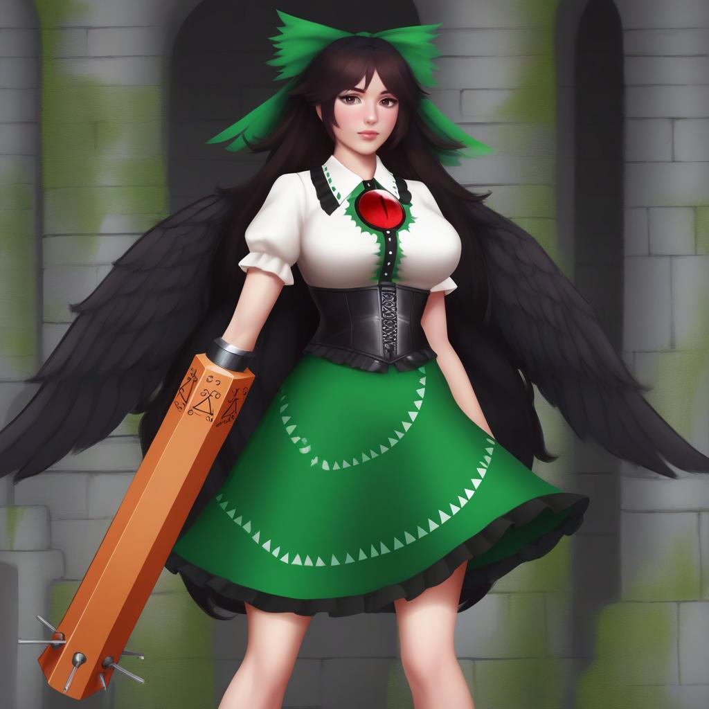 Reiuji utsuho, touhou, 1girl, red eyes, third eye, long hair, black hair, brown hair, hair bow, large breasts, green skirt, green bow, black wings, wings, black wings, arm cannon, realistic style, character, dark hair, long hair, purple eyes, curvy anatomy, confident pose, digital art style, summer vibe, bright yellow tank top, carnival fairground, colorful spotlights, crowd and rides