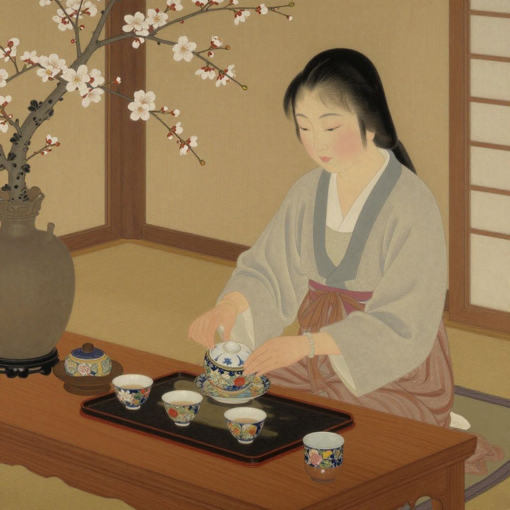 Asian oil painting portraying a traditional tea ceremony indoors, warm wood tones, intricate patterns on ceramics, soft lighting highlighting delicate hands and serene expressions amid cherry blossom decor.