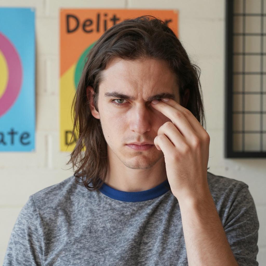 A man with long brown hair, blue face paint in a vertical stripe, serious expression, blue ured background. Man wears green and brown jacket, facial paint contrasts with skin tone. Textured blue background surrounds man.