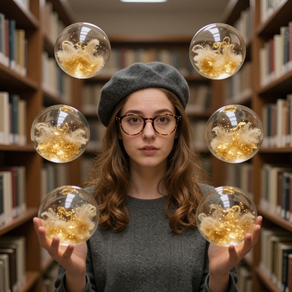 Librarian cataloging dreams: A young woman in a gray beret and tortoiseshell glasses stands amidst a library backdrop, surrounded by four floating glass orbs containing golden, fluffy dream-like substances, each orb suspended above her shoulders and arranged symmetrically.