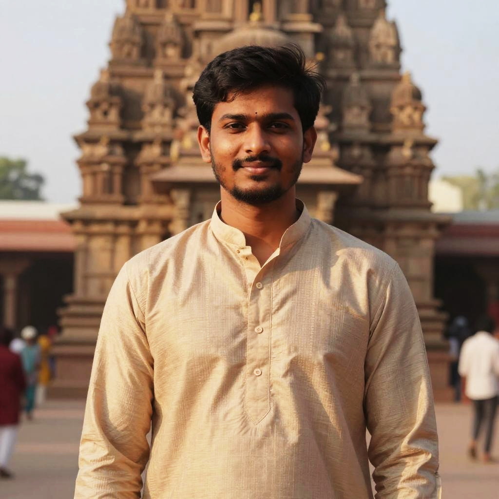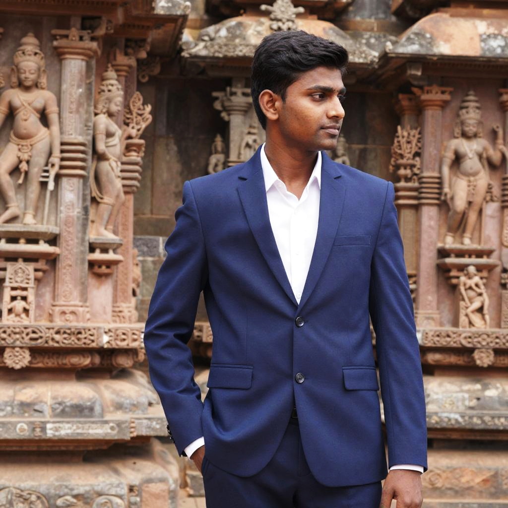 Photograph of a young Indian man with short, dark hair standing in front of an ornate, ancient temple with detailed carvings. He's wearing a sharp, navy blue suit with a white dress shirt, looking to his right with a serious expression. The temple's stone carvings are reddish-brown and weathered, adding a historical vibe to the image. The man's right hand is in his pocket, and his left sleeve is slightly rolled up.