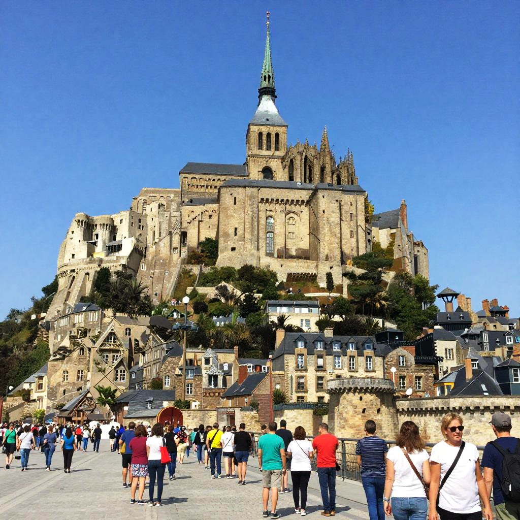 Photograph of a bustling scene in front of Mont Saint-Michel, a historic, fortified island in France. The image shows a large crowd of people in colorful clothes standing on a stone wall in the foreground, looking up at the towering, medieval abbey with its central spire, surrounded by ancient buildings and greenery on the hill. The sky is clear blue.