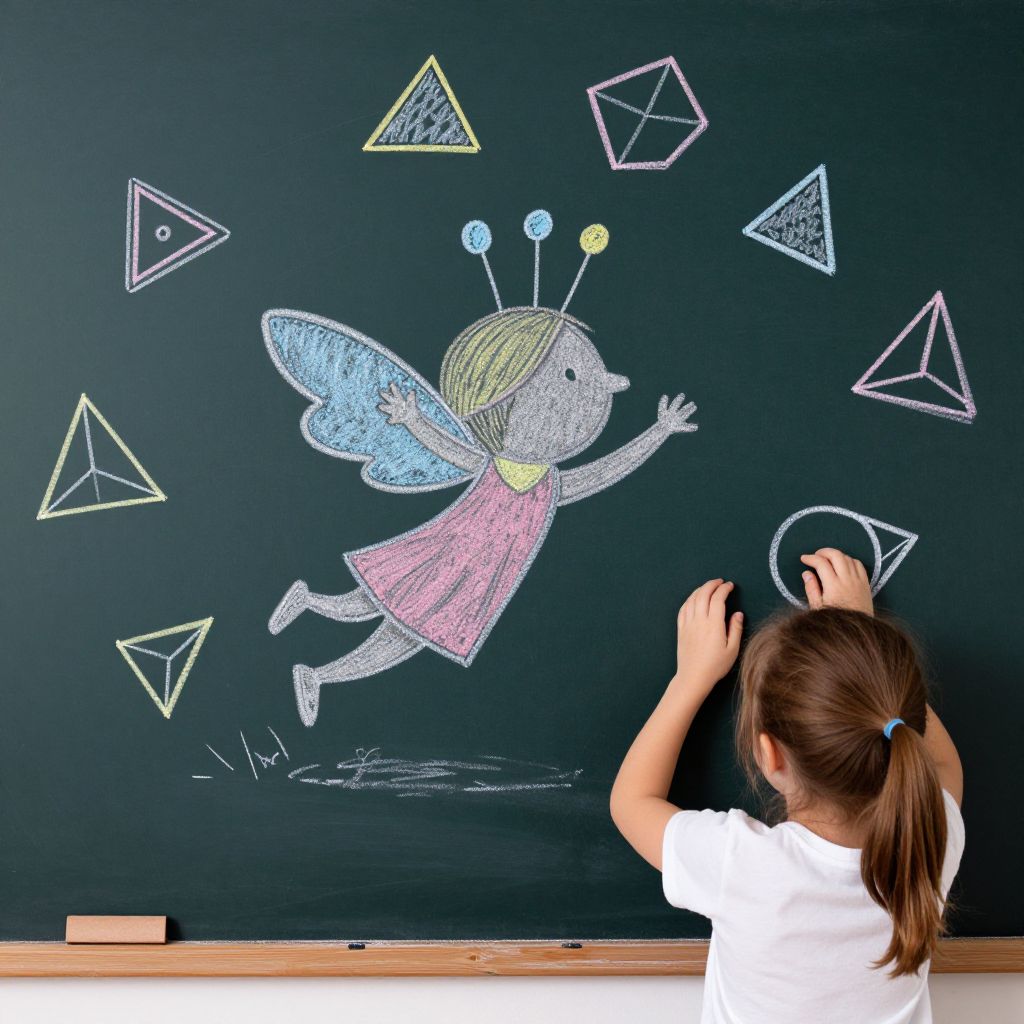 A child drawings with luminous chalk bring their school chalkboard to life: the fractions sprout wings and dance, while geometry shapes become flying creatures.