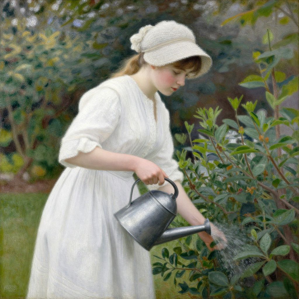 Young woman in a white dress and hat watering a green shrub with a metallic watering can in a serene garden setting, depicted in the Impressionist style by Berthe Morisot (Private Collection).