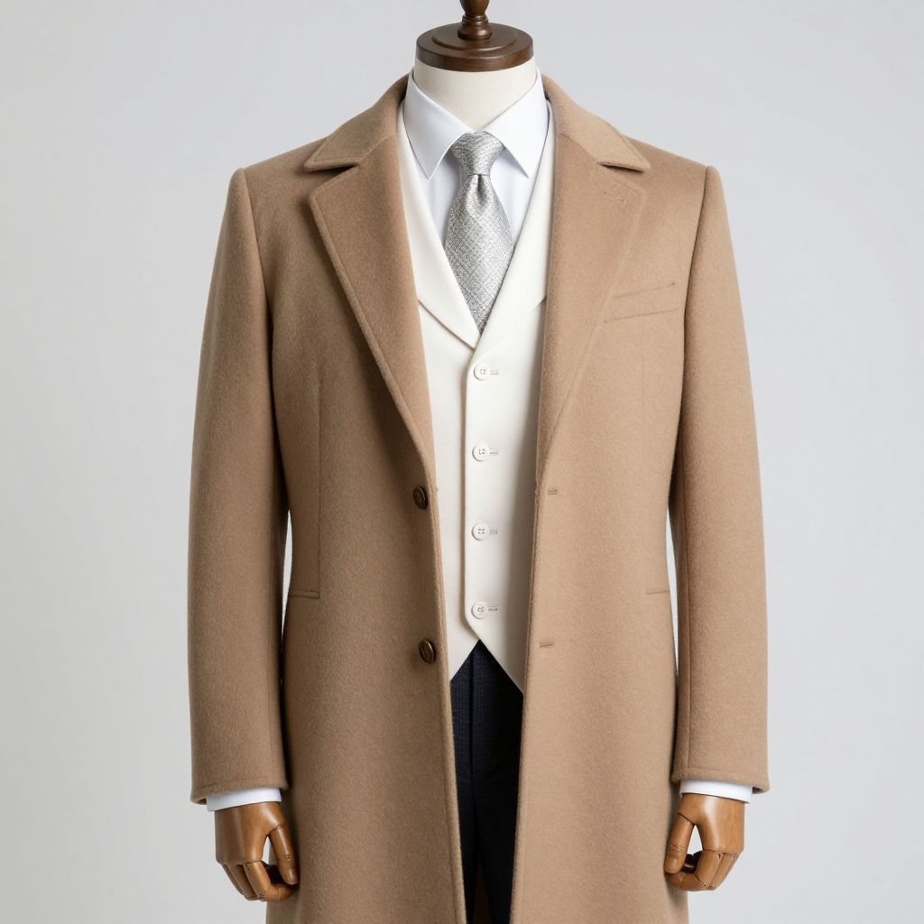 Photograph of a beige, long, double-breasted overcoat on a mannequin, paired with a white dress shirt, silver tie, and