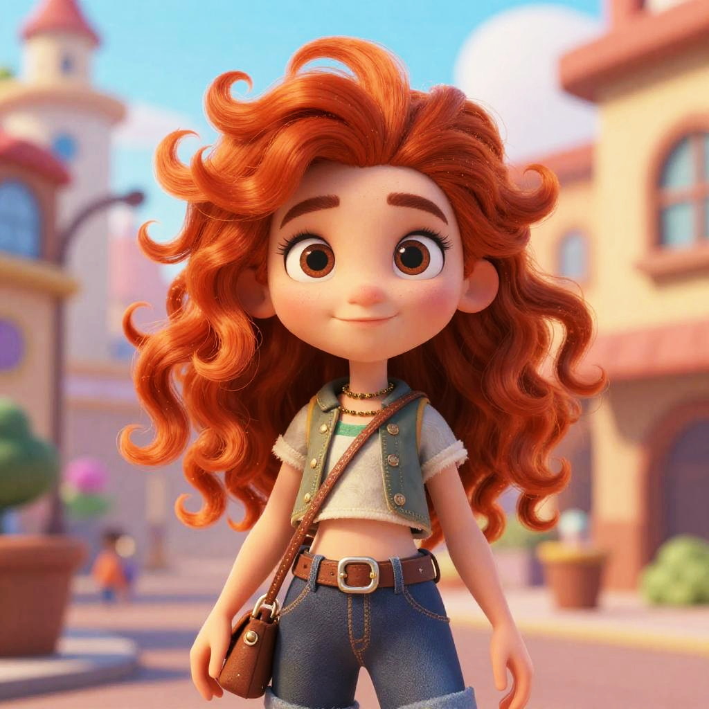 Red hair girl with vibrant fiery locks styled in playful curls, wearing a whimsical outfit, standing confidently in a colorful animated cityscape, soft lighting, cartoon style with rich textures and vivid colors