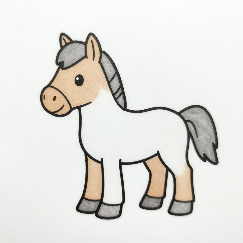 Simple and clean line art cartoon horse illustration designed for a children's coloring book, featuring a cute horse with grey mane, tail, and hooves, and beige and white body colors, rendered in a Pixar-style.