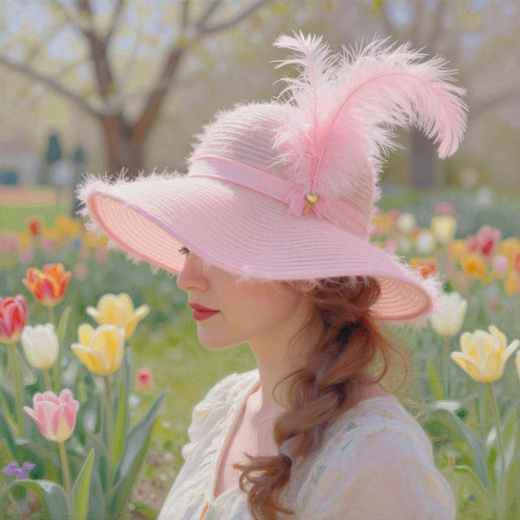 Woman wearing a stylish pink feather hat in a lively spring garden, bright flowers all around, a soft breeze gently moving the feathers, impressionist painting style