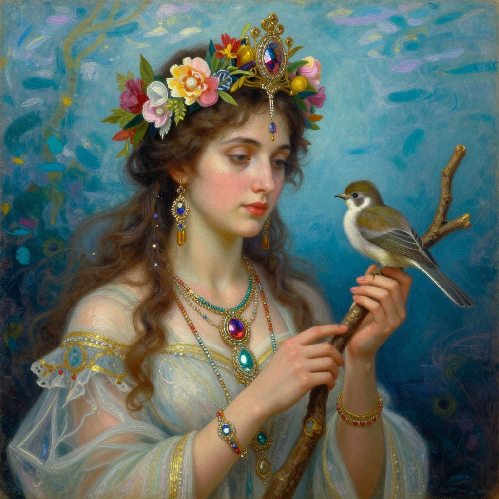 Digital painting of a fair-skinned, young woman with wavy brown hair, adorned with white flowers, wearing a sheer, gold-embroidered