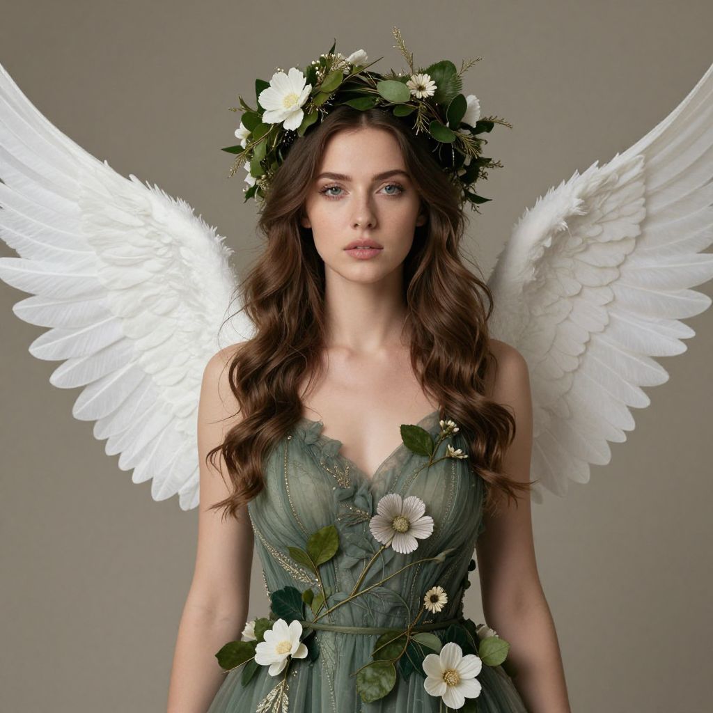Photograph of a fair-skinned woman with long, wavy brown hair, wearing a green, sleeveless, V-neck dress adorned with white flowers and green leaves. She has large, white, feathered wings extending from her back and a floral crown on her head, featuring white flowers and green leaves. Her expression is serene, and she gazes directly at the camera. The background is a simple, solid gray, putting full focus on the woman and her angelic, nature-inspired appearance. The image has a soft, ethereal quality.