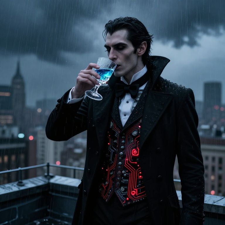 Vampire AI prompt: an AI vampire in a high-tech city rooftop, wearing a Victorian-style coat with exposed circuitry and glowing red runes, sipping from a crystal glass filled with liquid code, under a stormy sky of digital rain.