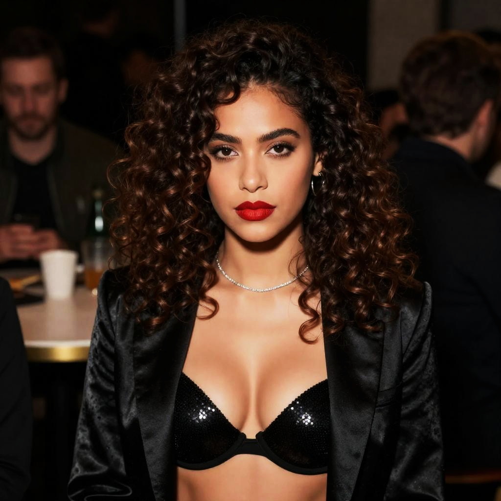 The image showcases a stylish woman posing confidently in a dazzling gold outfit against a shimmering gold backdrop. Her curly hairstyle and glamorous jewelry add a touch of elegance, perfectly complementing the vibrant aesthetic.