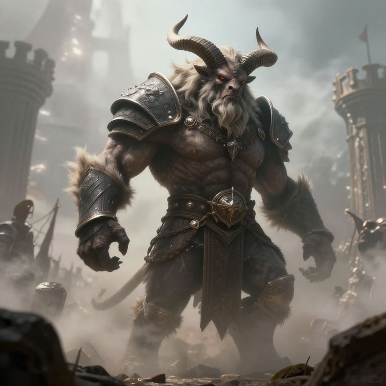 Minotaur DnD height towering over a medieval fantasy battlefield, muscular build with detailed fur and horns, clad in ancient armor, ethereal mist surrounding, dramatic lighting, high fantasy style.