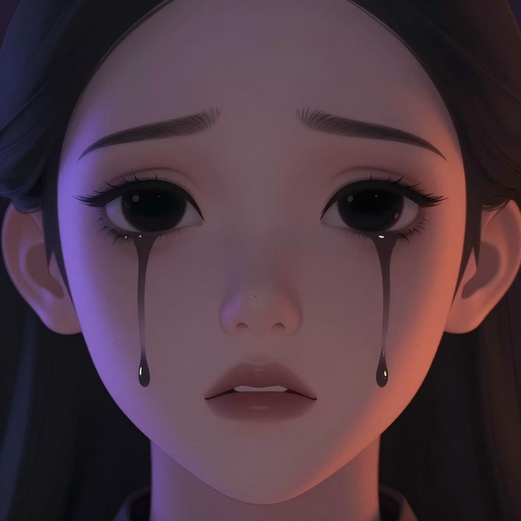 Close-up digital illustration of a human face featuring black hollow eye sockets and long black tears streaming down the cheeks. The face expresses sadness with furrowed brows and slightly parted lips. The skin has a subtle purple and orange glow against a dark background, emphasizing the somber mood.