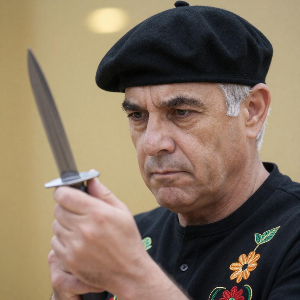 Close-up photograph of a middle-aged man with white hair and a black beret, focused intently on a dagger held in his right hand. He wears a black shirt with colorful embroidery. Golden bokeh background. Man's facial expression is serious and determined. One hand, dagger, beret, black shirt, golden background.