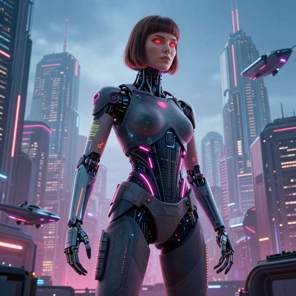 Judge Dredd Robocop patrolling a chaotic cyberpunk cityscape, glowing skyscrapers, flying vehicles overhead, night scene with vibrant neon lights and gritty textures