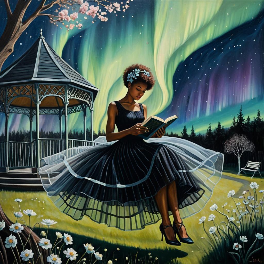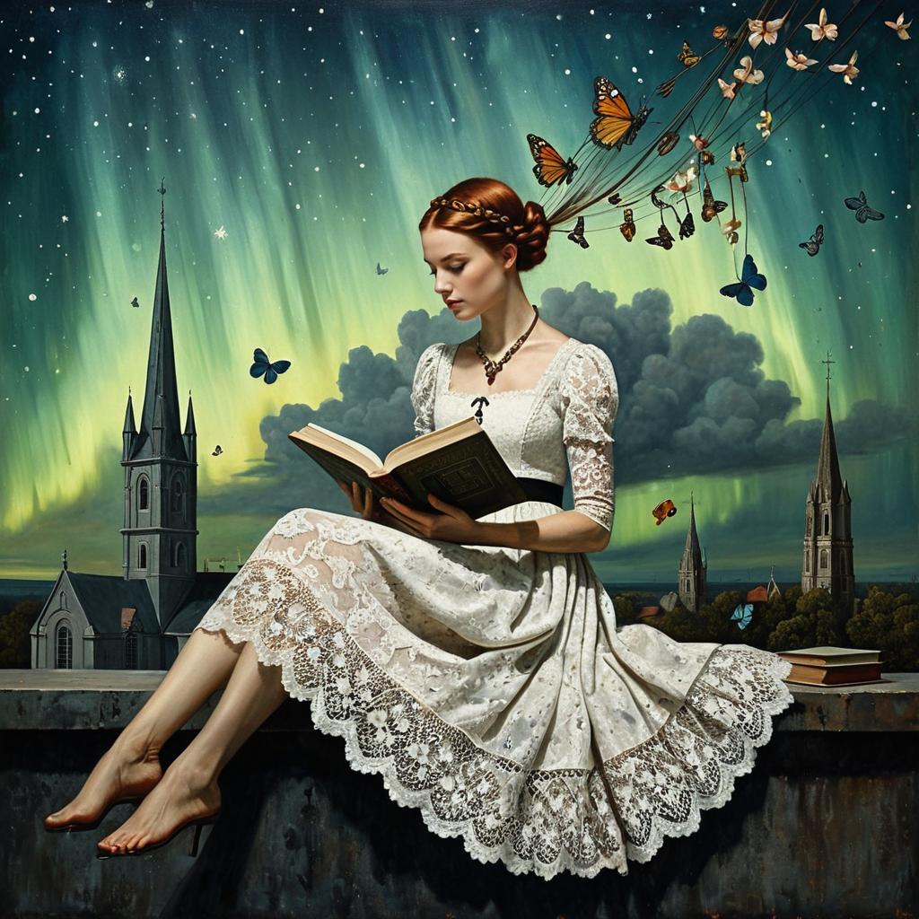 Surrealistic oil painting of a redheaded woman in a cotton dress sitting on a steel wire in the air, reading a book. Flowers in her hair, loose curls, surrounded by clouds, songbirds, and an observatory, Contemporary Surrealism inspired by Toucanna Morales, Remedios Varo, Leonora Carrington