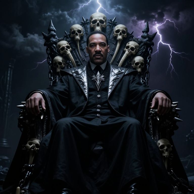 Evil MLK reimagined as a villainous mastermind in a gothic setting, wearing regal dark robes with sharp metallic accents, ominous clouds overhead, lightning illuminating a throne made of bones and chains